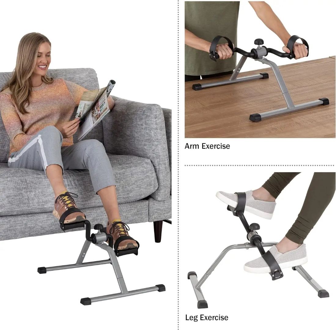 Pedal exerciser is used for rehabilitating weak arm and foot muscles.